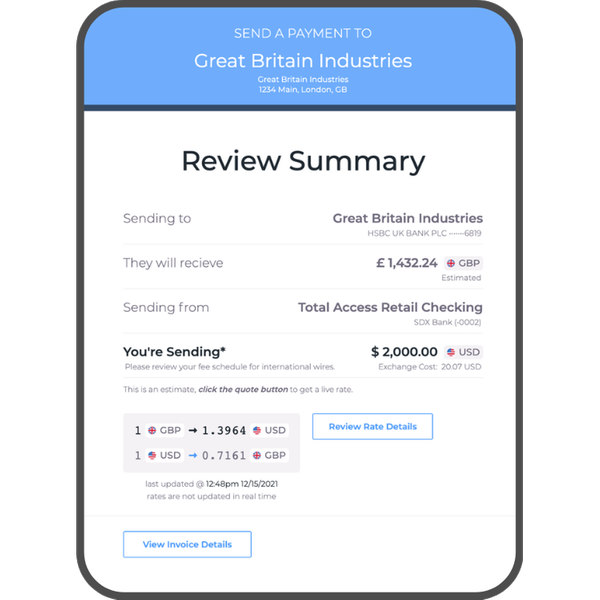 With immediate transaction posting and live FX rates, you'll always get the best rates available. And, there aren't cutoff times to draft or send payments.